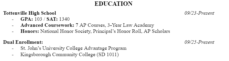 Next is dual enrollment. I only put this because I take college now and st. johns classes if you don’t have either, you could remove it. (I would highly recommend taking harder classes)