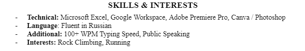 This section is short but important. It tells the reader what you’re good at and gives your resume personality. Split it into small categories so it looks clean.