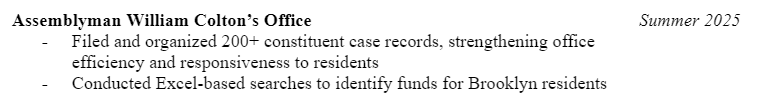 When I first started applying to internships (by cold-calling which I’ll go in more depth about later) I had no formal work experience. I found my first bit of experience through volunteering, and my first real opportunity came through a volunteering office in Brooklyn, where I helped with filing documents, fixing their Excel sheets, and some other random tasks. It wasn’t a big-name internship, but it taught me how professional environments work, how to communicate with adults, and how to take initiative when no one tells you what to do.